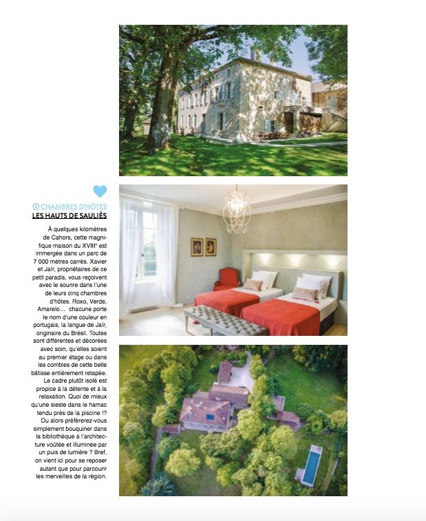 Ici & Ailleurs, magazine de voyage international, a fait un reportage sur le département du Lot dans lequel il mentionne notre maison d’hôtes Les Hauts de Sauliès. Dans son article de 7 pages sur le Lot, Lucas Lahargoue, journaliste principal, décrit les Hauts de Sauliès comme un petit paradis près de Cahors (18kms) , où il fait bon vivre et où le cadre isolé est propice à la détente et à la relaxation, sans oublier de faire allusion aux hamacs et à la piscine de 16m de long chauffée.